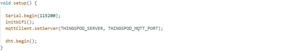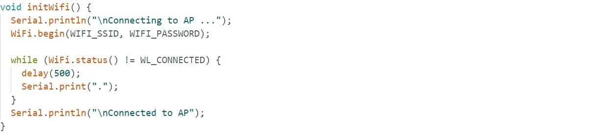 در تابع ()setup، تابع راهانداز وای-فای را مینویسیم. این تابع را بعد از تابع ()setup تعریف میکنیم. در این تابع، عدم اتصال به شبکه وای فای مورد نظر در سریال مانیتور پرینت میشود تا زمانی که با موفقیت به وای فای وصل شود. سپس، سرور را راه اندازی کرده و سنسور dht را فعال میکنیم.