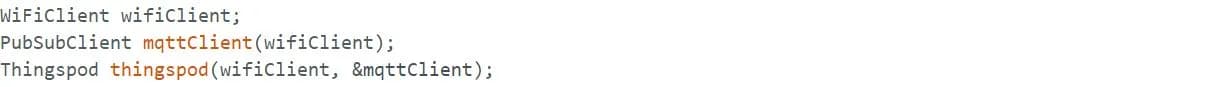 یک object از کتابخانه WiFiClient با نام wifiClient برای استفاده از تابعهای آن ایجاد میکنیم . همچنین برای ایجاد شی MQTT هم از کتابخانه PubSubClient استفاده میکنیم و Object وای فای را برای ارتباط با اینترنت به آن پاس میدهیم. سپس یک object از تینگزپاد با نام thingspod ایجاد کرده و object وای فای و MQTT را به آن پاس میدهیم.