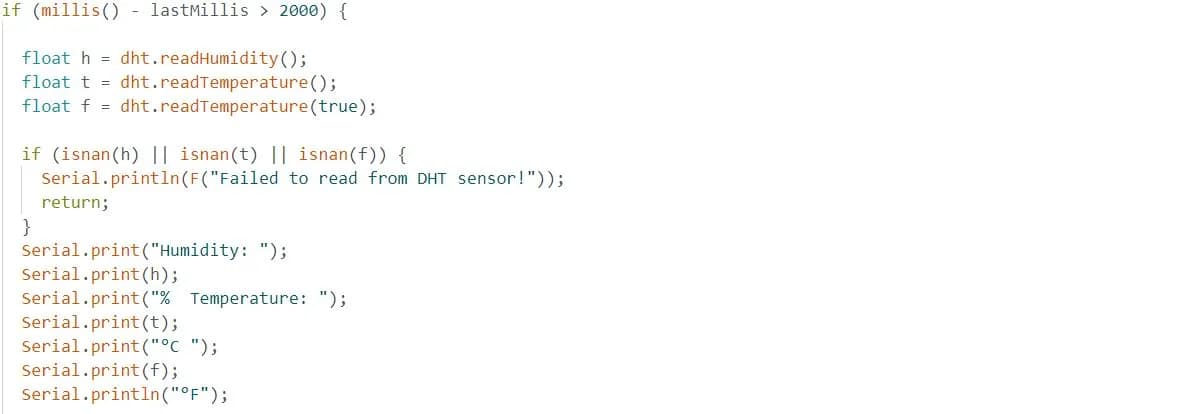 در ادامه، میخواهیم دادههای دما و رطوبت را هر دو ثانیه یکبار اندازهگیری کنیم و در سریال مانیتور نمایش دهیم. در صورت بروز خطا در خواندن دما و رطوبت، عبارت Failed to read from DHTsensor در سریال مانیتور پرینت میشود.