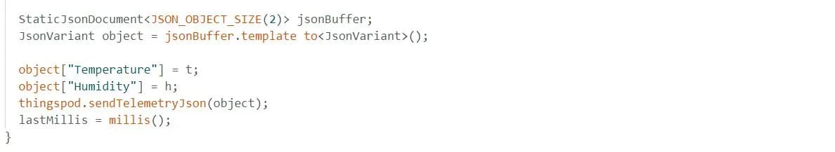 سپس میخواهیم برای نظارت از راه دور اینترنتی، این دادهها را به پلتفرم تینگزپاد نیز ارسال کنیم. بنابراین، یک بافر جیسون با سایز ۲ ایجاد میکنیم (زیرا قرار است فقط دو مقدار دما و رطوبت را ارسال کنیم.). سپس این مقادیر را به فرمت جیسون تبدیل میکنیم.