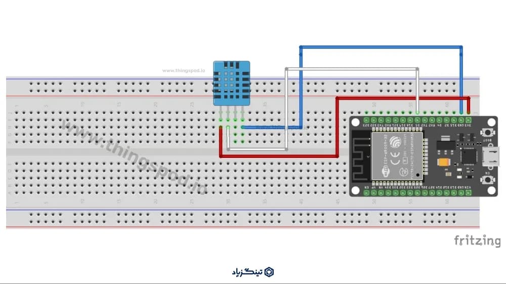 ماژول ESP32 دارای پین هدرهایی است که میتواند روی بردبورد قرار بگیرد. پس با استفاده از فضای خالی وسط برد بورد، ماژول را روی بردبورد قرار داده و سنسور DHT11 را نیز هر جای دیگری بر روی بردبورد قرار میدهیم. سپس با سیمهای جامپر، پایه زمین DHT11 را به پین ماژول ESP32، پایه VCC را به پین ۳.۳ ولت ESP32 و پایه خروجی داده رو به پین شماره ۵ (D5) ESP32 وصل میکنیم. (همانند تصویر زیر)