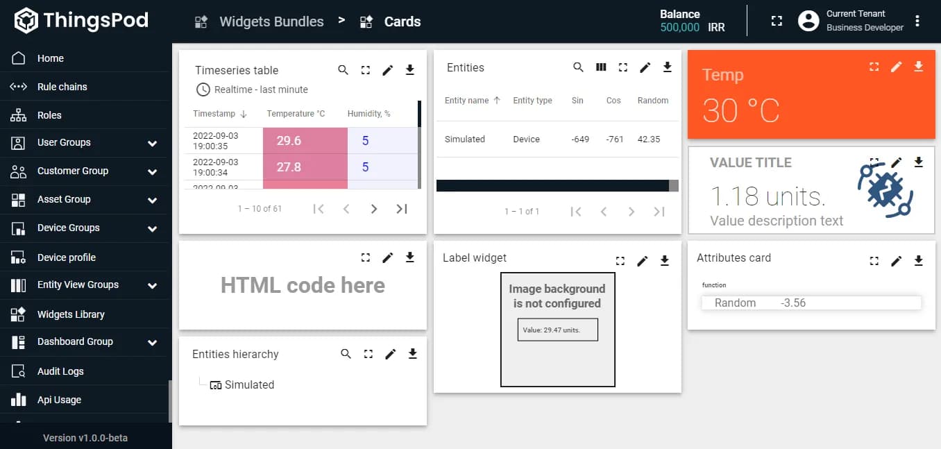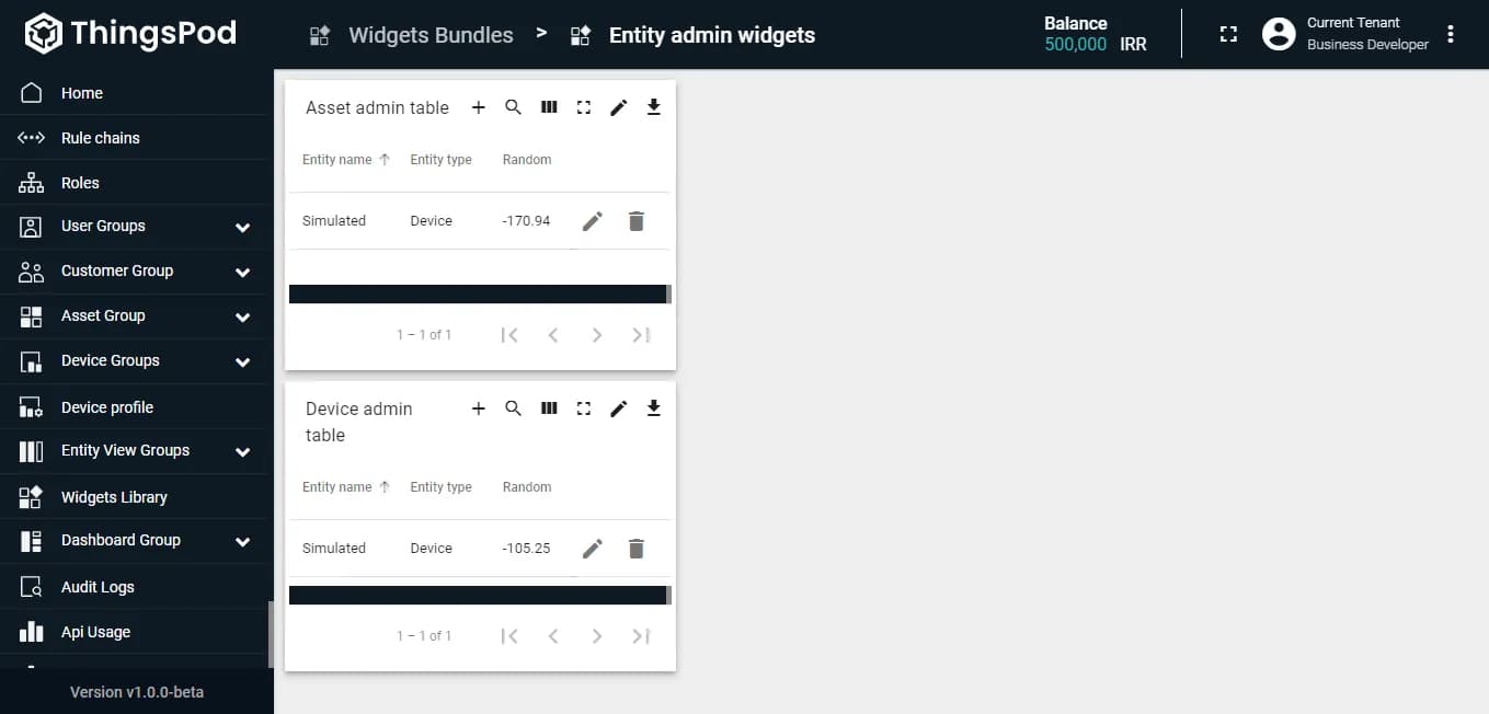 با استفاده از ویجتهای این دستهبندی، دیگر نیازی به استفاده از ابزارهای پلتفرم برای اضافه کردن موجودیتهای مختلف مانند دستگاه و دارایی نخواهد بود. کاربر میتواند از طریق داشبورد و به صورت دستی، موجودیت اضافه کرده و در صورت نیاز آنها را ویرایش کند. در نهایت، اطلاعات هر موجودیت در قالب جداول به شما نمایش داده خواهد شد.