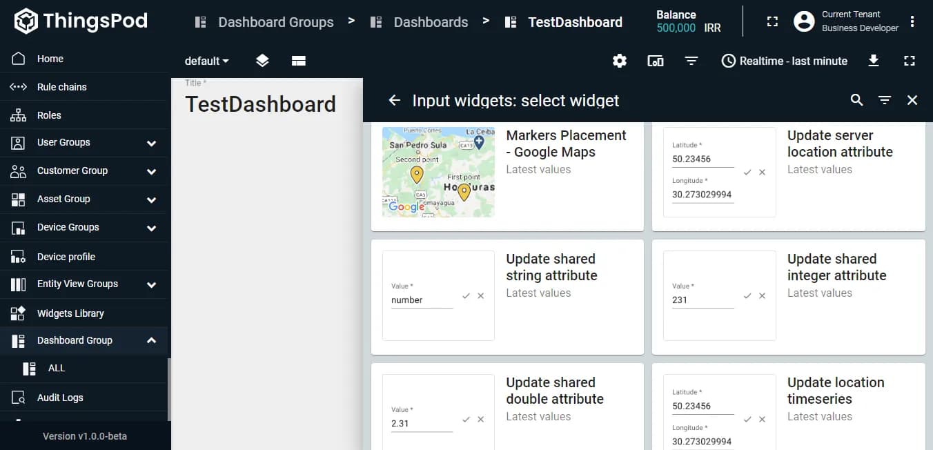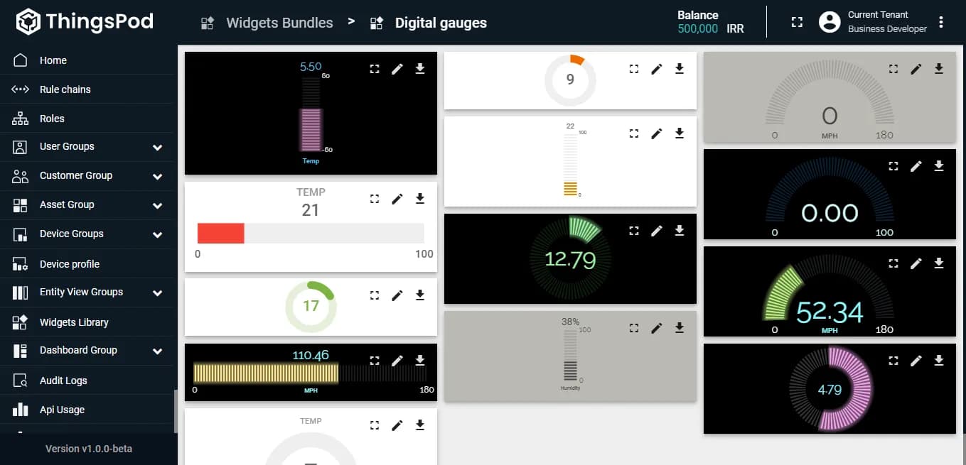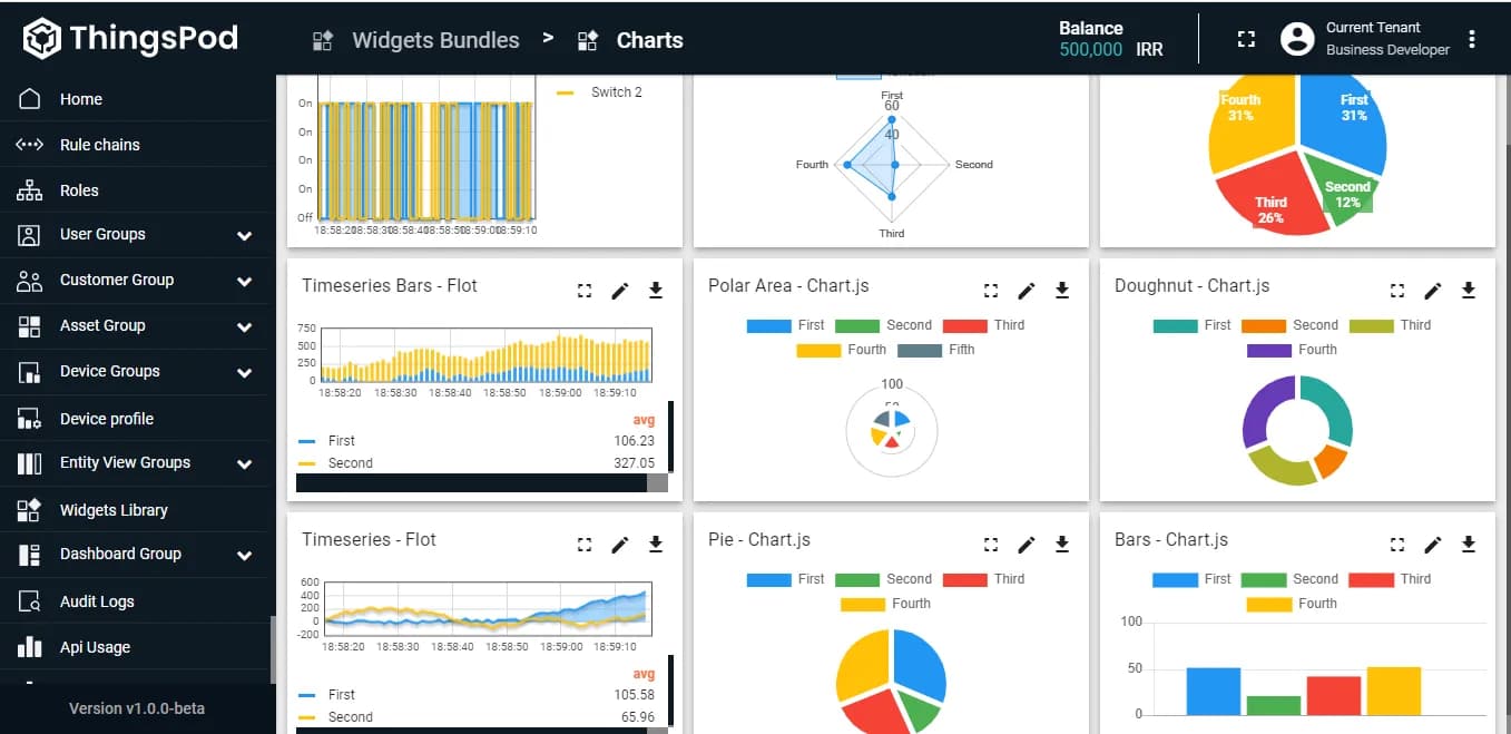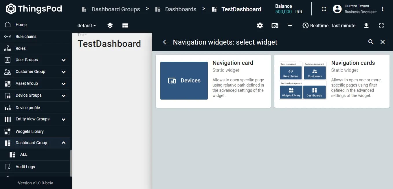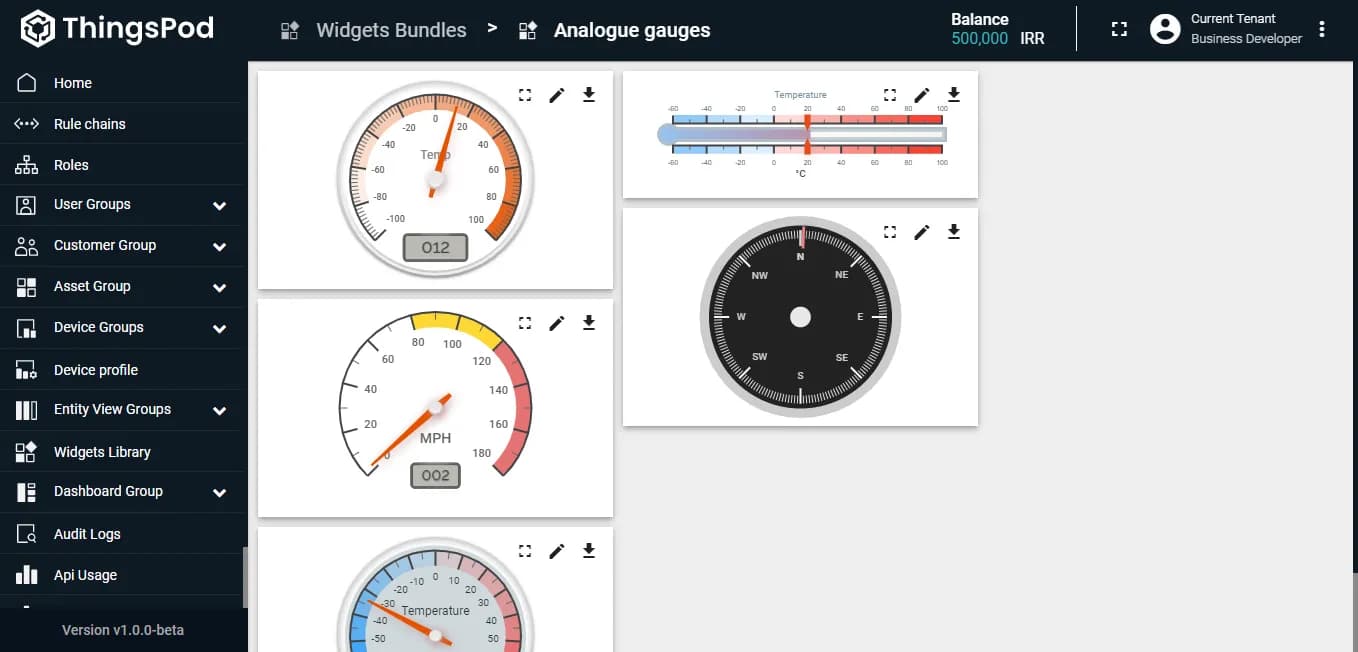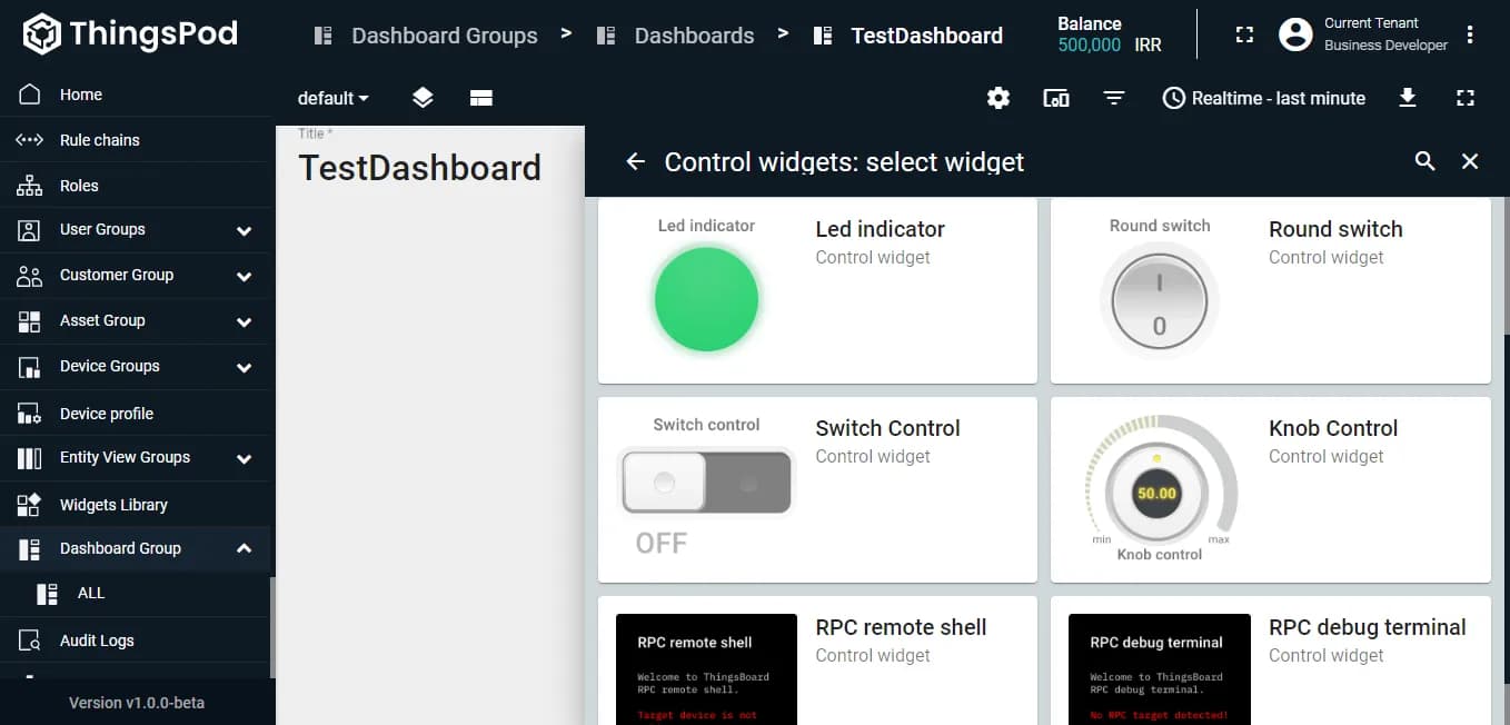 داشبوردها فضاهایی برای نمایش اطلاعات یک یا چند دستگاه هستند. جهت نمایش اطلاعات در هر داشبورد میتوان از ویجتهای گرافیکی مانند نمودارها، جداول و ... استفاده کرد. اکثر ویجتهای مورد نیاز کاربر به صورت پیشفرض در پلتفرم موجود هستند؛ اما، میتوانید از طریق دستور JSON، ویجتهای سفارشی خود را نیز به پلتفرم اضافه کرده و یا اینکه، ویجتهای پیشفرض پلتفرم را ویرایش و شخصیسازی کنید.