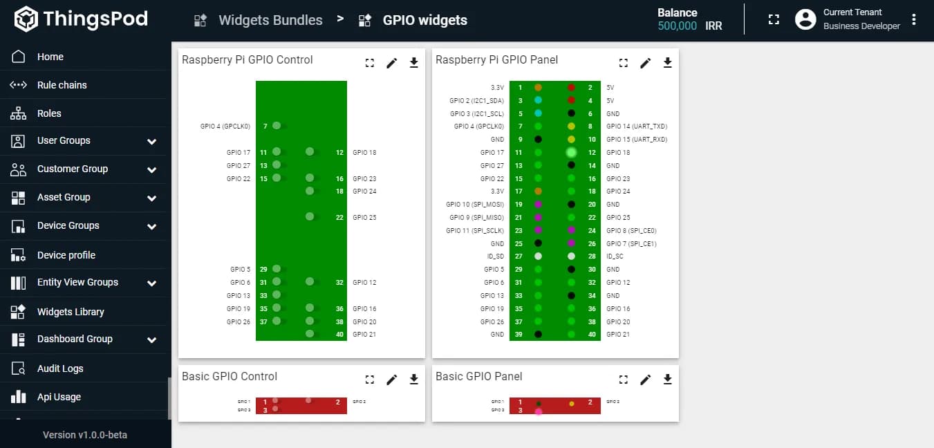 در پلتفرم اینترنت اشیا تینگزپاد، پنلهای استاندارد رزبریپای با حداکثر پینهای استاندارد در اختیار شماست که امکان ارسال دستورات RPC را به هر ورودی/ خروجی و یا نمایش اطلاعات لحظهای هر پین را به سادگی فراهم سازد.